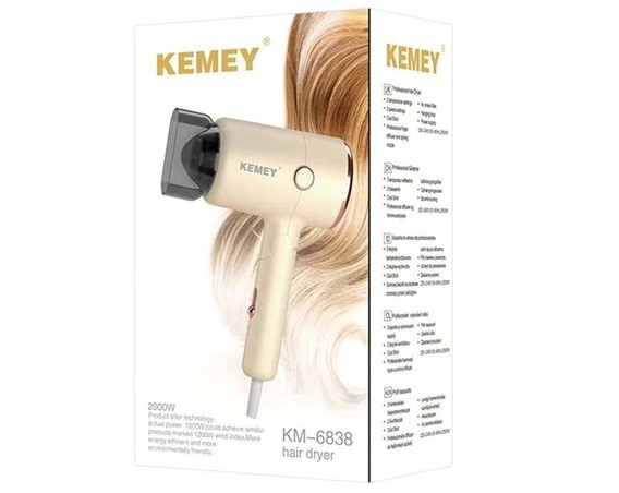 Фен для волосся KEMEI KM-6838 — це високотехнологічний прилад, розроблений з урахуванням потреб професійних стилістів і перукарів. Потужний двигун змінного струму з тривалим терміном експлуатації потужністю 2000 Вт забезпечує швидке сушіння волосся й ефективне укладання, тоді як іонізатор сприяє природному насиченню волосся.